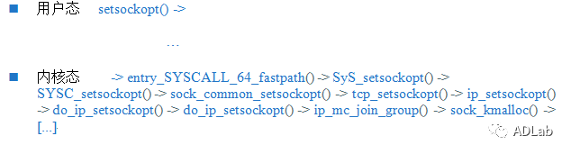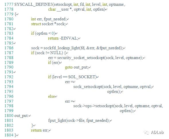 进入内核调用SyS_setsockopt()函数,level 设置的不为 SOL_SOCKET即可,一般设置为SOL_IP,在1798行处被调用。紧接着调用sock_common_setsockopt()函数。