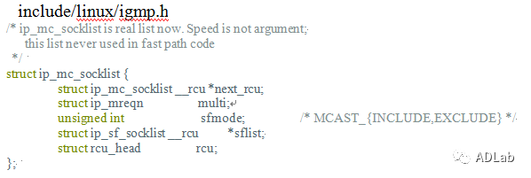 next_rcu指向链表的下一个节点;multi表示组信息,即在哪一个本地接口上,加入到哪一个多播组;sfmode是过滤模式,取值为MCAST_INCLUDE或MCAST_EXCLUDE,分别表示只接收sflist所列出的那些源的多播数据报和不接收sflist所列出的那些源的多播数据报;sflist是源列表。