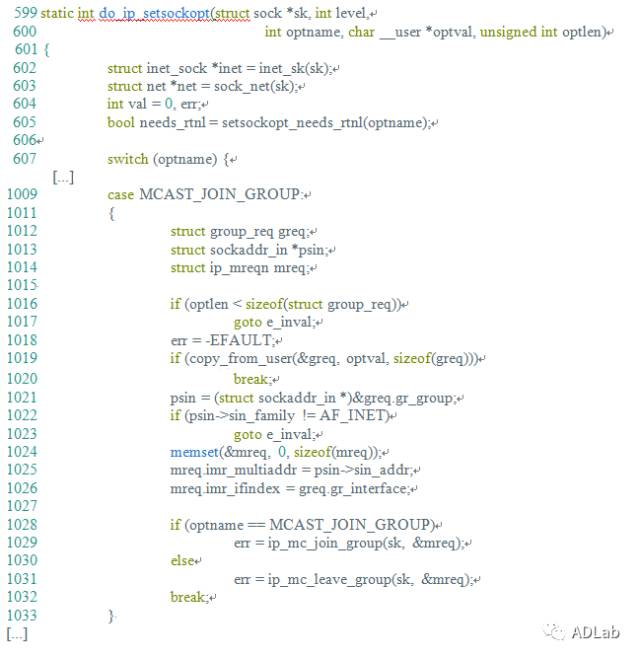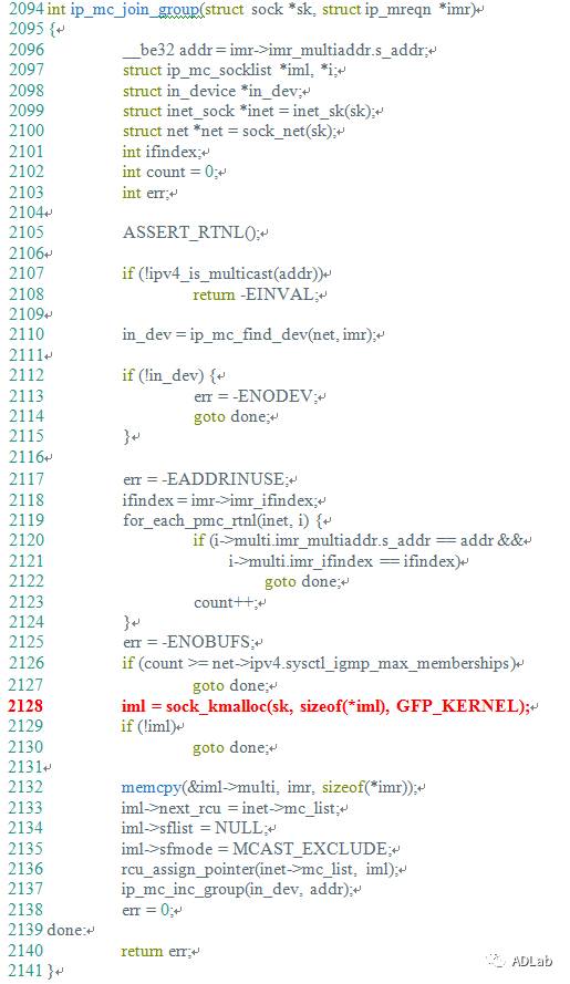 代码1019~1021行调用copy_from_user()将用户态的数据拷贝到内核态。之前已经将option设置为MCAST_JOIN_GROUP,紧接着调用ip_mc_join_group()函数: